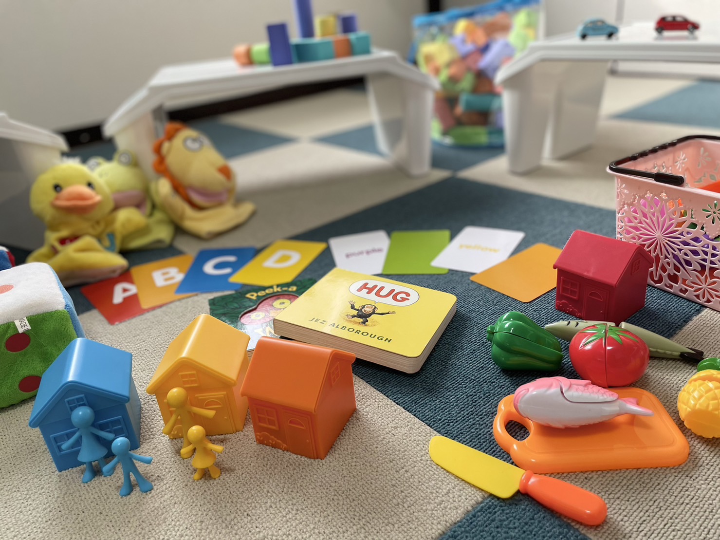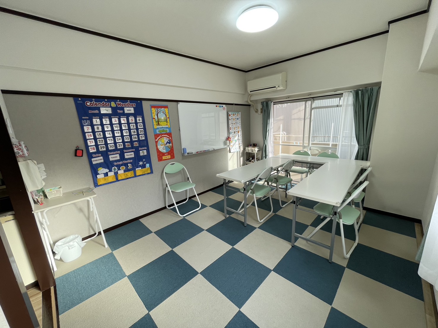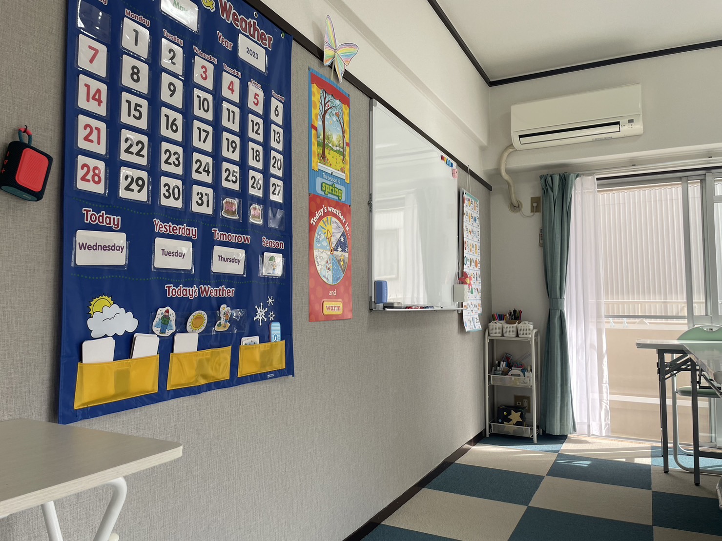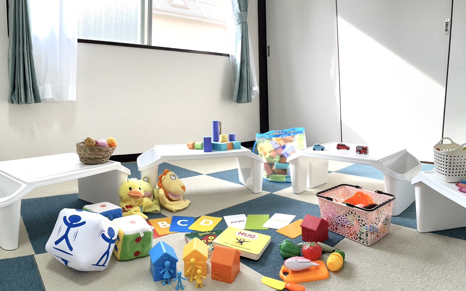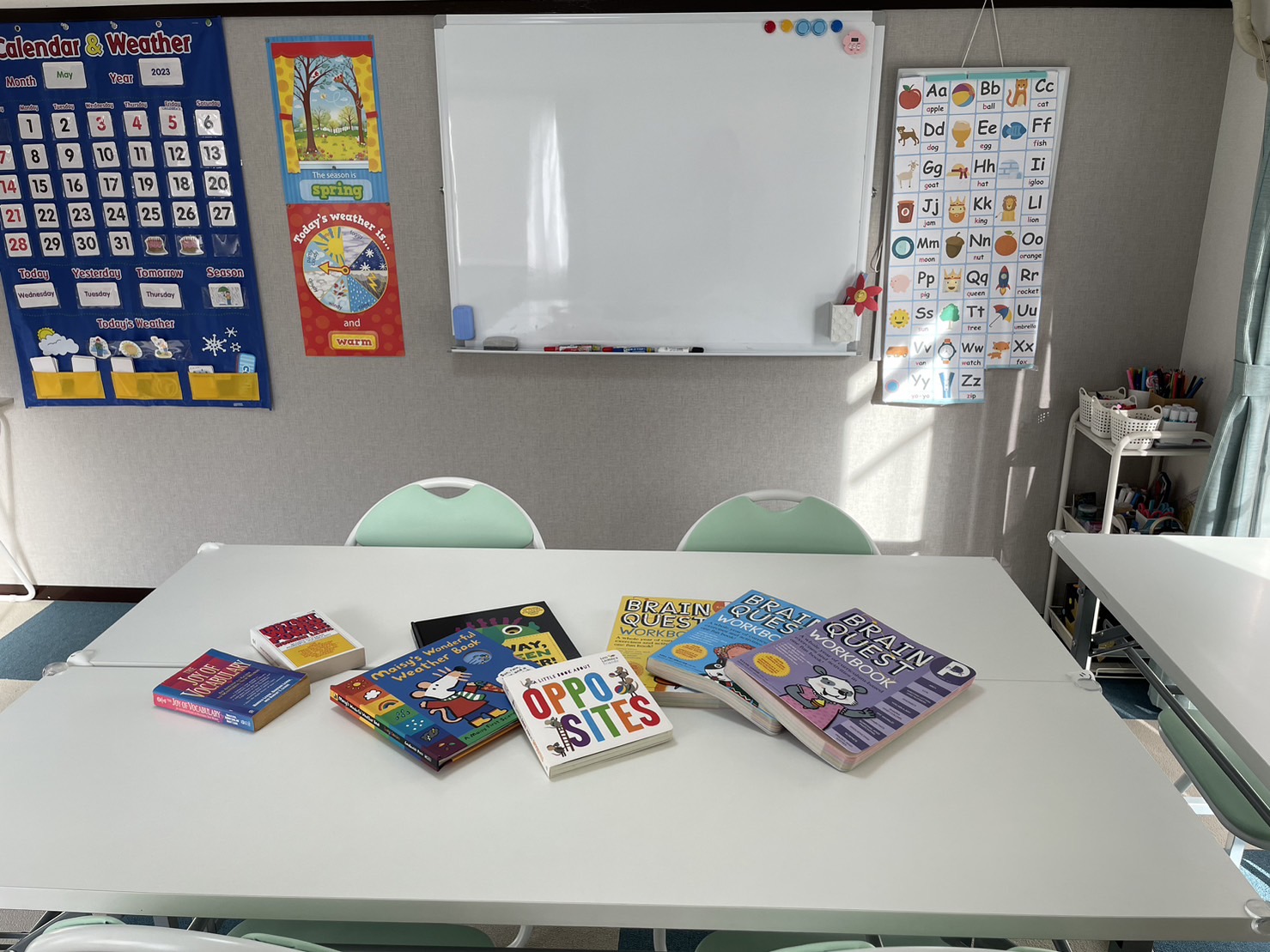 親子クラスでは、専用の子供テーブルを使って、親御さんとお子さん、そして先生で楽しく英語を学びます。面白そうなおもちゃと使いやすいテーブルで、小さなお子様でもリラックスなレッスン♪